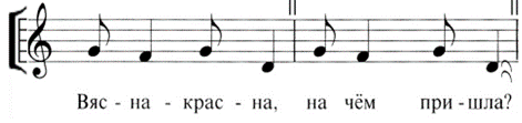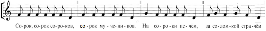 В случаях, когда поэтические тексты бытуют отдельно в разных музыкальных образцах, их использование в обряде оказывается полностью идентичным: они звучат во время ритуальных действий с орнитоморфным печеньем. В музыкальном отношении все они представлены формульными напевами[2] с диамбической ритмической основой на основе ритмоформулы ♪♩♪♩ в объеме большой терции или кварты с основным опорным тоном в конце мелодической ячейки[3] (примеры 2‑4):