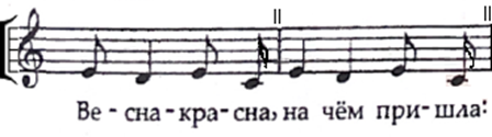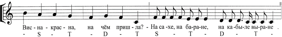 На данной территории напевы большетерцовых закличек (как «веснянок», так и «чувилек») приобретают сходство с частушками, в частности с наигрышем «Подгорная» (отвечающим гармонической схеме STDT, отмеченной в нотном примере ниже). Возможно, такая стилевая «модуляция» напевов связана с практикой исполнения их под гармошку в сельском клубе (пример 8). Показательно, что теперь опорный тон появляется только в конце строфы из четырех построений, а не в конце каждой формулы: