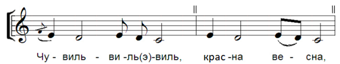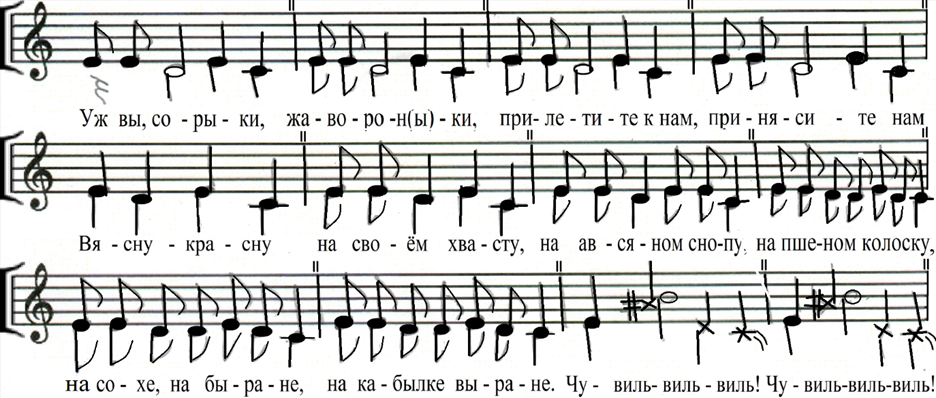 Привлекают внимание поэтические тексты местных ранневесенних закличек: на тульских территориях два типовых сюжета, связанных с зачинами 1) «Весна‑красна» и 2) «Жавороночки» или «Чувиль»[1] (далее по тексту — «веснянки» и «чувильки») часто объединяются в одном музыкальном образце. Вариант подобного текста представлен в примере 1.
