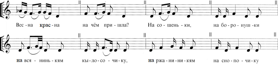 [2] Здесь и далее описание данного типа структур и аналитическое оформление нотаций производятся в соответствии с теоретическими положениями и методологией, изложенными в монографии Б. Б. Ефименковой «Ритм в произведениях русского вокального фольклора» [7, 37–49].